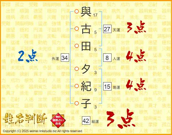 與(17画)古(5画)田(5画) 夕(3画)紀(9画)子(3画)