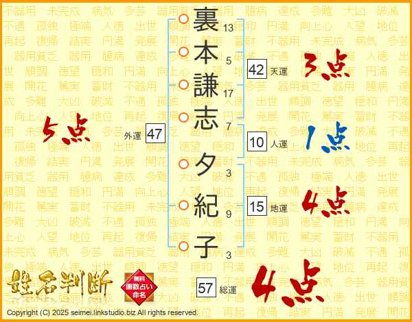 裏(13画)本(5画)謙(17画)志(7画) 夕(3画)紀(9画)子(3画)