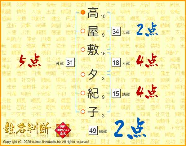 高(10画)屋(9画)敷(15画) 夕(3画)紀(9画)子(3画)