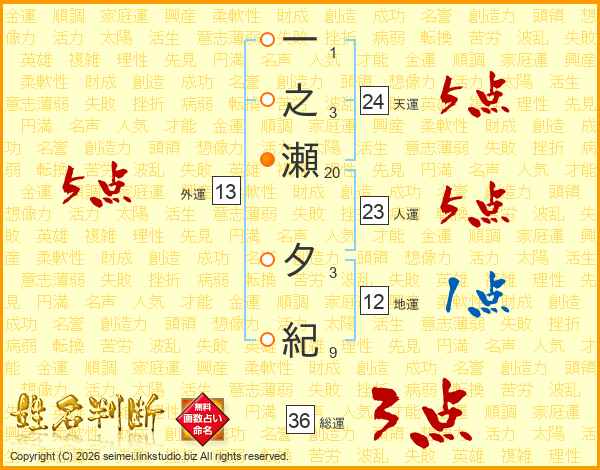 一之瀬夕紀さんの外運は13画の5点!