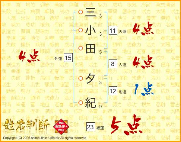 三(3画)小(3画)田(5画) 夕(3画)紀(9画)