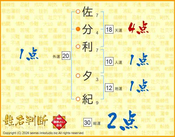佐(7画)分(4画)利(7画) 夕(3画)紀(9画)