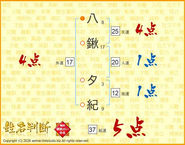 八鍬夕紀さんの総運は37画の5点!