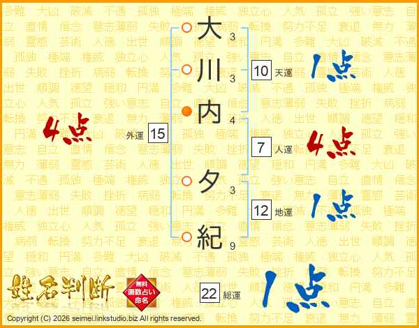 大(3画)川(3画)内(4画) 夕(3画)紀(9画)