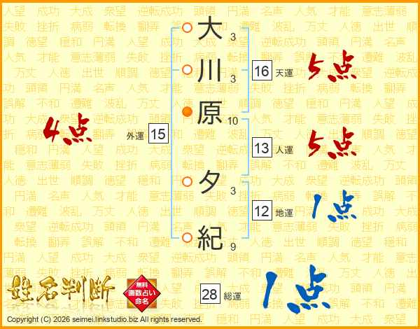 大(3画)川(3画)原(10画) 夕(3画)紀(9画)