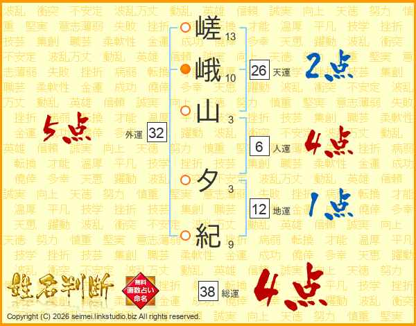 嵯(13画)峨(10画)山(3画) 夕(3画)紀(9画)