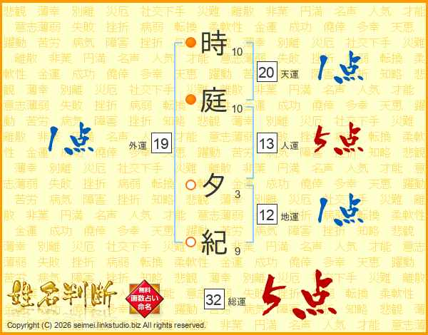 時(10画)庭(10画) 夕(3画)紀(9画)