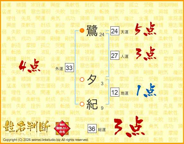 鷺夕紀さんの外運は33画の4点!