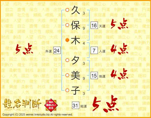 久(3画)保(9画)木(4画) 夕(3画)美(9画)子(3画)