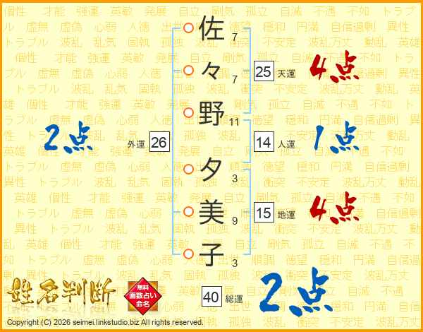 生活面を象徴する運勢です。外部から受ける影響力を表し、結婚運、家庭運や職場、環境への順応性を表します。総運から人運を引いた画数。姓や名が1文字の場合を除く。