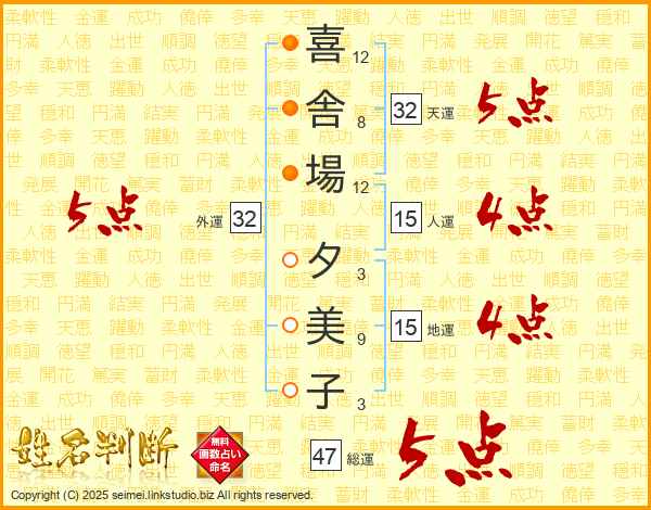 喜(12画)舎(8画)場(12画) 夕(3画)美(9画)子(3画)