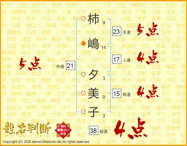 柿(9画)嶋(14画) 夕(3画)美(9画)子(3画)