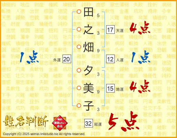田(5画)之(3画)畑(9画) 夕(3画)美(9画)子(3画)
