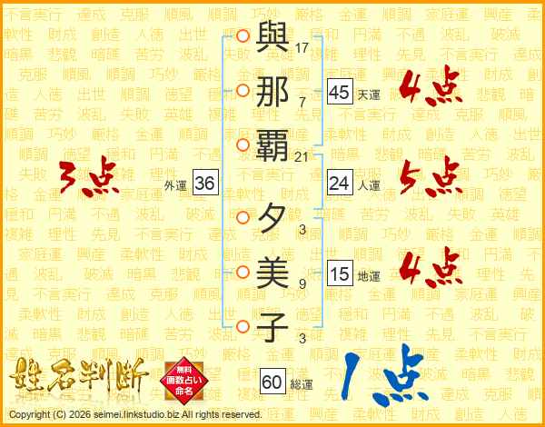 與(17画)那(7画)覇(21画) 夕(3画)美(9画)子(3画)