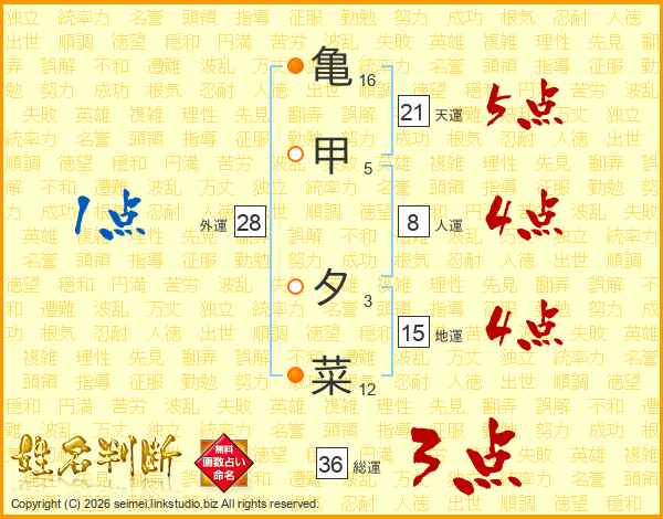 亀(16画)甲(5画) 夕(3画)菜(12画)