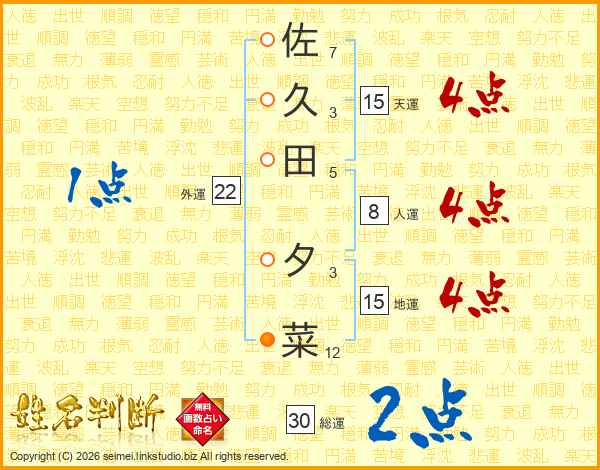 佐久田夕菜さんの総運は30画の2点!