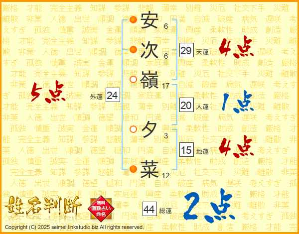 安(6画)次(6画)嶺(17画) 夕(3画)菜(12画)