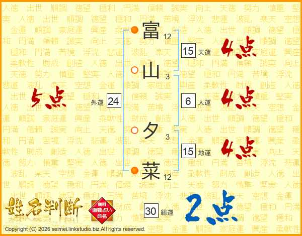 生活面を象徴する運勢です。外部から受ける影響力を表し、結婚運、家庭運や職場、環境への順応性を表します。総運から人運を引いた画数。姓や名が1文字の場合を除く。