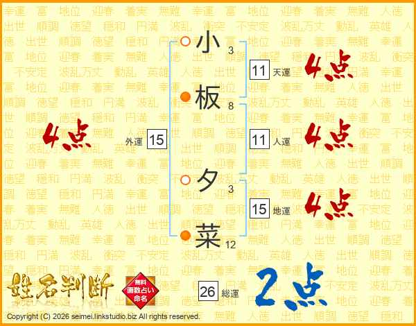 小板夕菜さんの総運は26画の2点!