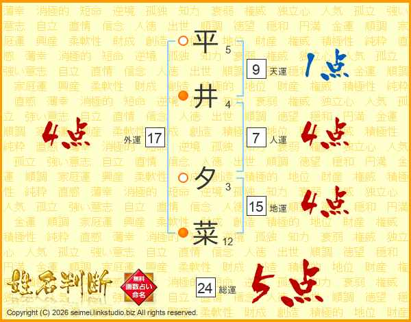 平井夕菜さんの総運は24画の5点!