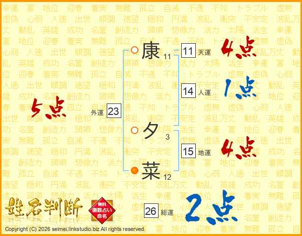 生活面を象徴する運勢です。外部から受ける影響力を表し、結婚運、家庭運や職場、環境への順応性を表します。総運から人運を引いた画数。姓や名が1文字の場合を除く。