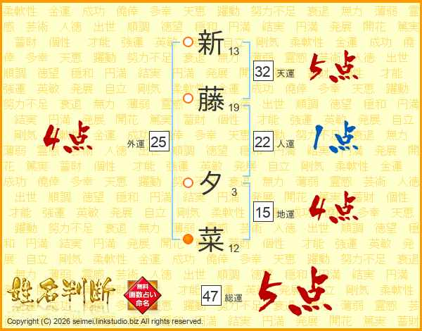新(13画)藤(19画) 夕(3画)菜(12画)