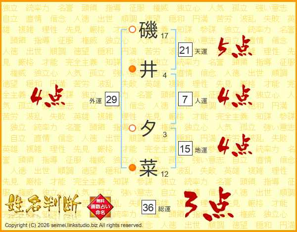 磯(17画)井(4画) 夕(3画)菜(12画)