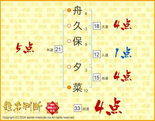 舟(6画)久(3画)保(9画) 夕(3画)菜(12画)