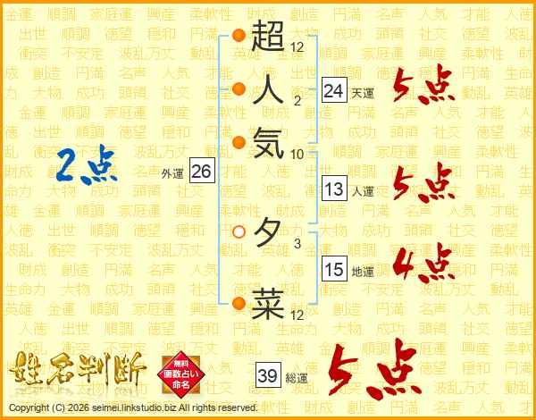 超人気夕菜さんの総運は39画の5点!
