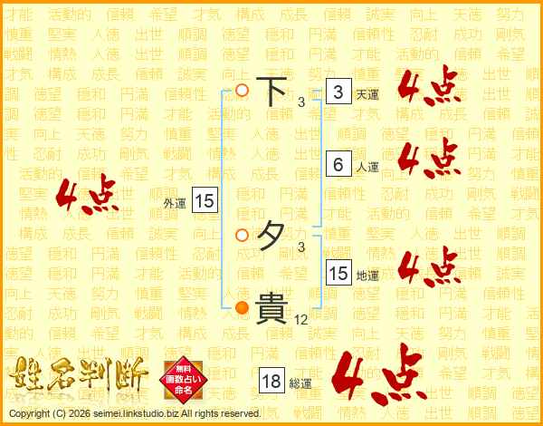 家系が持つ宿命的な運勢を表します。祖先から受け継いだ苗字ですので自分の力が及びません。家柄を象徴します。苗字の合計画数。