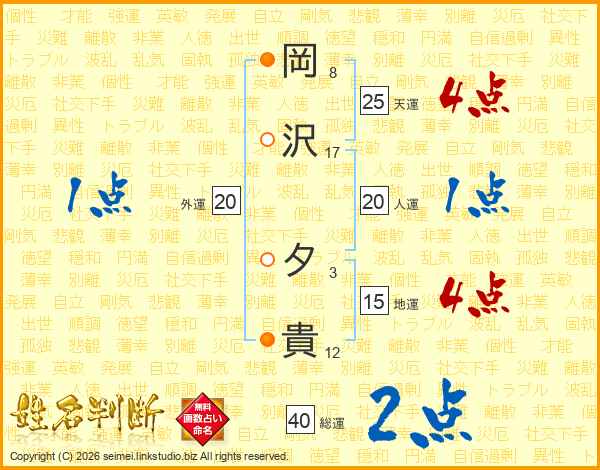岡(8画)沢(17画) 夕(3画)貴(12画)