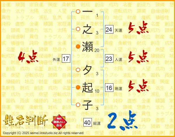 一(1画)之(3画)瀬(20画) 夕(3画)起(10画)子(3画)