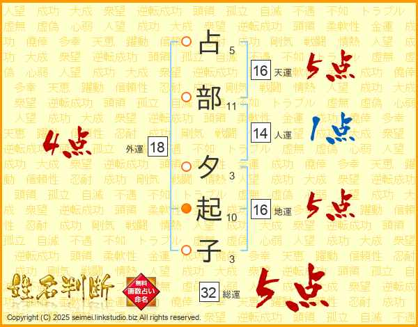 生活面を象徴する運勢です。外部から受ける影響力を表し、結婚運、家庭運や職場、環境への順応性を表します。総運から人運を引いた画数。姓や名が1文字の場合を除く。