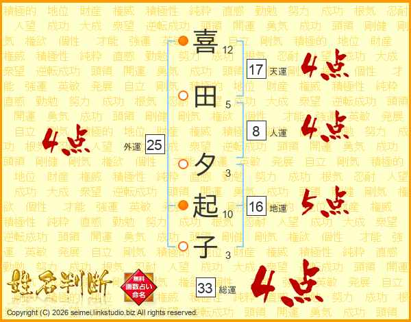 喜(12画)田(5画) 夕(3画)起(10画)子(3画)