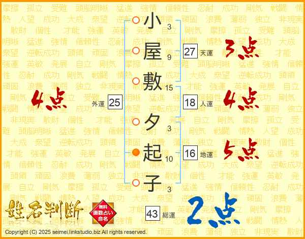 小屋敷夕起子さんの総運は43画の2点!