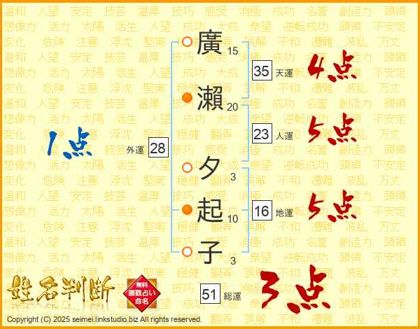 廣(15画)瀨(20画) 夕(3画)起(10画)子(3画)