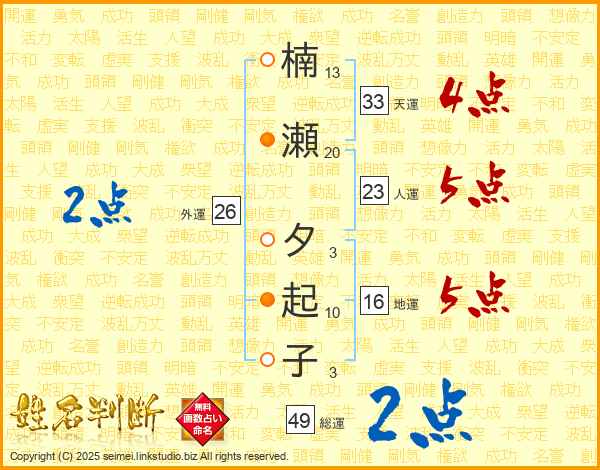 楠(13画)瀬(20画) 夕(3画)起(10画)子(3画)