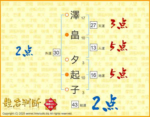 澤(17画)畠(10画) 夕(3画)起(10画)子(3画)