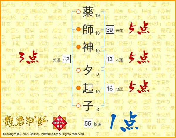 薬(19画)師(10画)神(10画) 夕(3画)起(10画)子(3画)