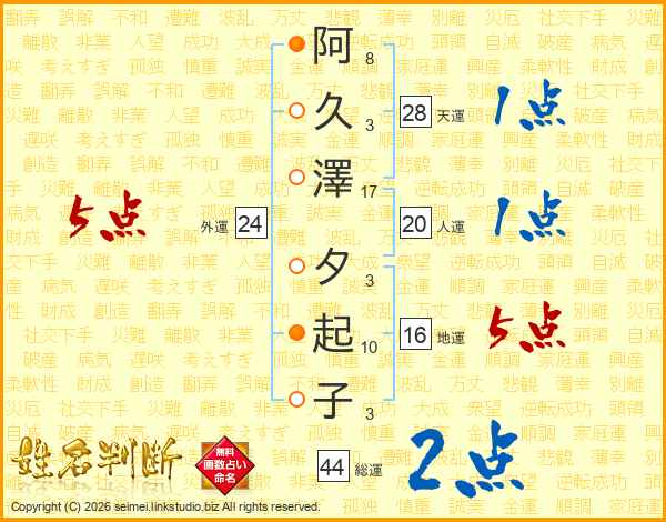阿(8画)久(3画)澤(17画) 夕(3画)起(10画)子(3画)