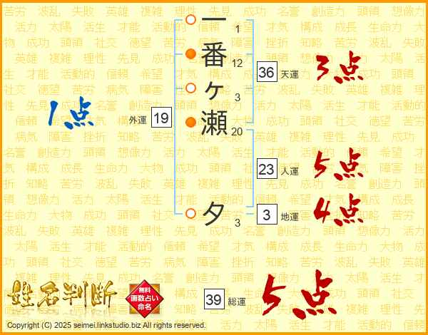 一(1画)番(12画)ヶ(3画)瀬(20画) 夕(3画)