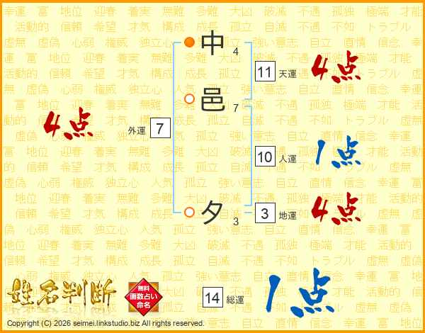 生活面を象徴する運勢です。外部から受ける影響力を表し、結婚運、家庭運や職場、環境への順応性を表します。総運から人運を引いた画数。姓や名が1文字の場合を除く。