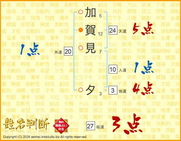 加賀見夕さんの総運は27画の3点!