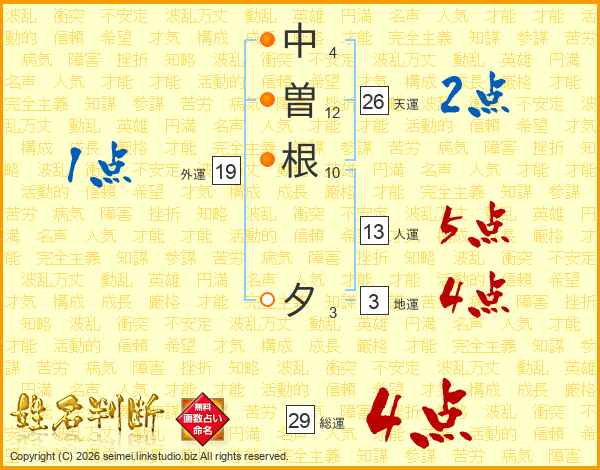 あなたの人生を表す1番重要な運勢です。生涯を通じて影響する総合運となり、主に50歳以降の晩年期に影響を及ぼします。苗字と名前の合計画数。