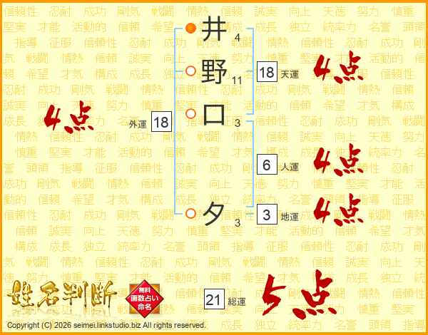 家系が持つ宿命的な運勢を表します。祖先から受け継いだ苗字ですので自分の力が及びません。家柄を象徴します。苗字の合計画数。