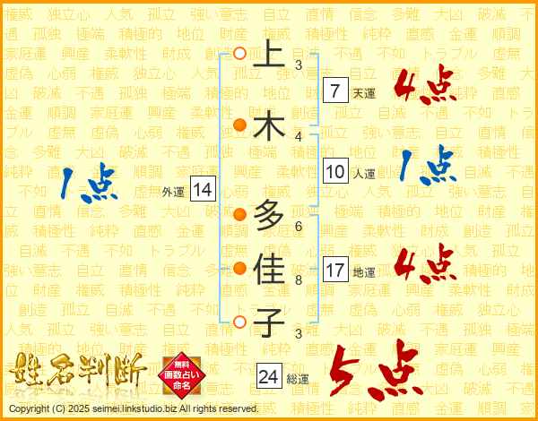 上(3画)木(4画) 多(6画)佳(8画)子(3画)