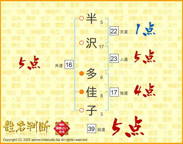 半(5画)沢(17画) 多(6画)佳(8画)子(3画)