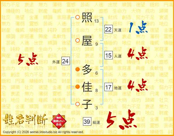 照(13画)屋(9画) 多(6画)佳(8画)子(3画)