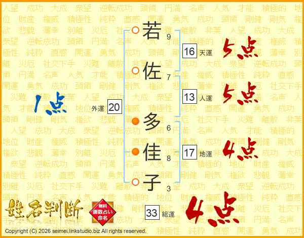 若(9画)佐(7画) 多(6画)佳(8画)子(3画)
