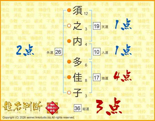 須(12画)之(3画)内(4画) 多(6画)佳(8画)子(3画)